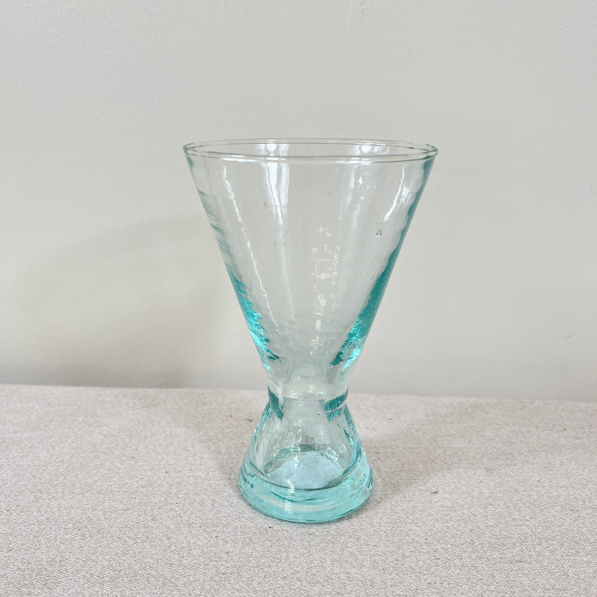 Our Moroccan-made martini/wine glass is part of a unique range of 100% recycled glassware, handmade exclusively in Morocco. Each glass is mouth-blown using traditional techniques that have been passed down since the 1940s. The beauty of recycled materials is reflected in the small air bubbles and slight imperfections found in each piece, making them one-of-a-kind.