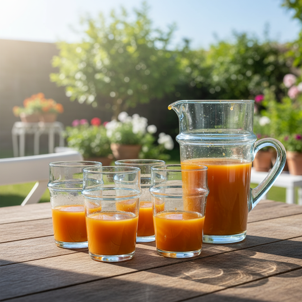 Discover the charm of our new range of handmade jugs, crafted from 100% recycled glass in Morocco. These jugs are mouth-blown using traditional techniques passed down through generations since the 1940s. Each piece showcases the unique beauty of recycled glass, with small air bubbles and slight imperfections that enhance their character.