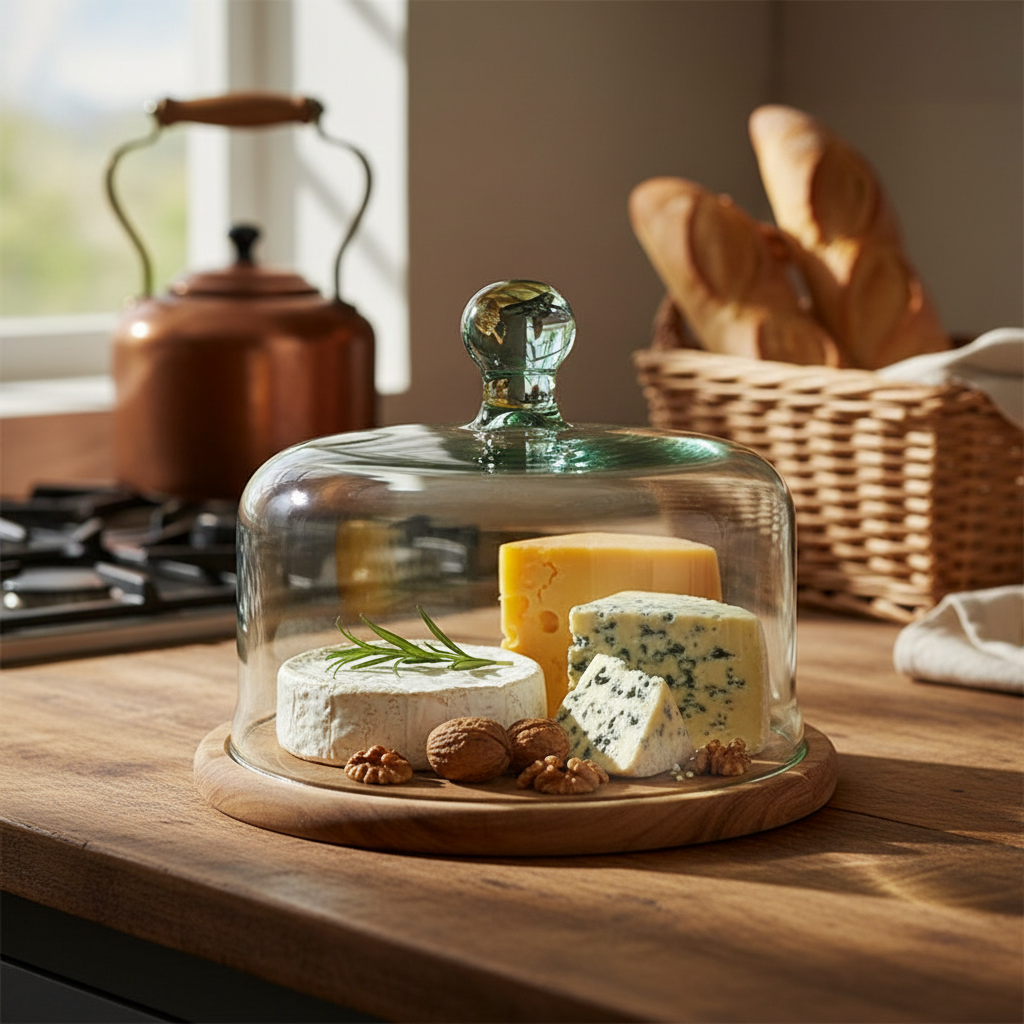 This elegant glass dome is thoughtfully crafted from 100% recycled glass, offering a sustainable and eco-friendly option for your kitchen or dining space. The base is made from responsibly sourced wood, reflecting a commitment to environmentally conscious materials. Made in the EU, this product combines ethical craftsmanship with timeless style, making it a perfect choice for eco-conscious homes.