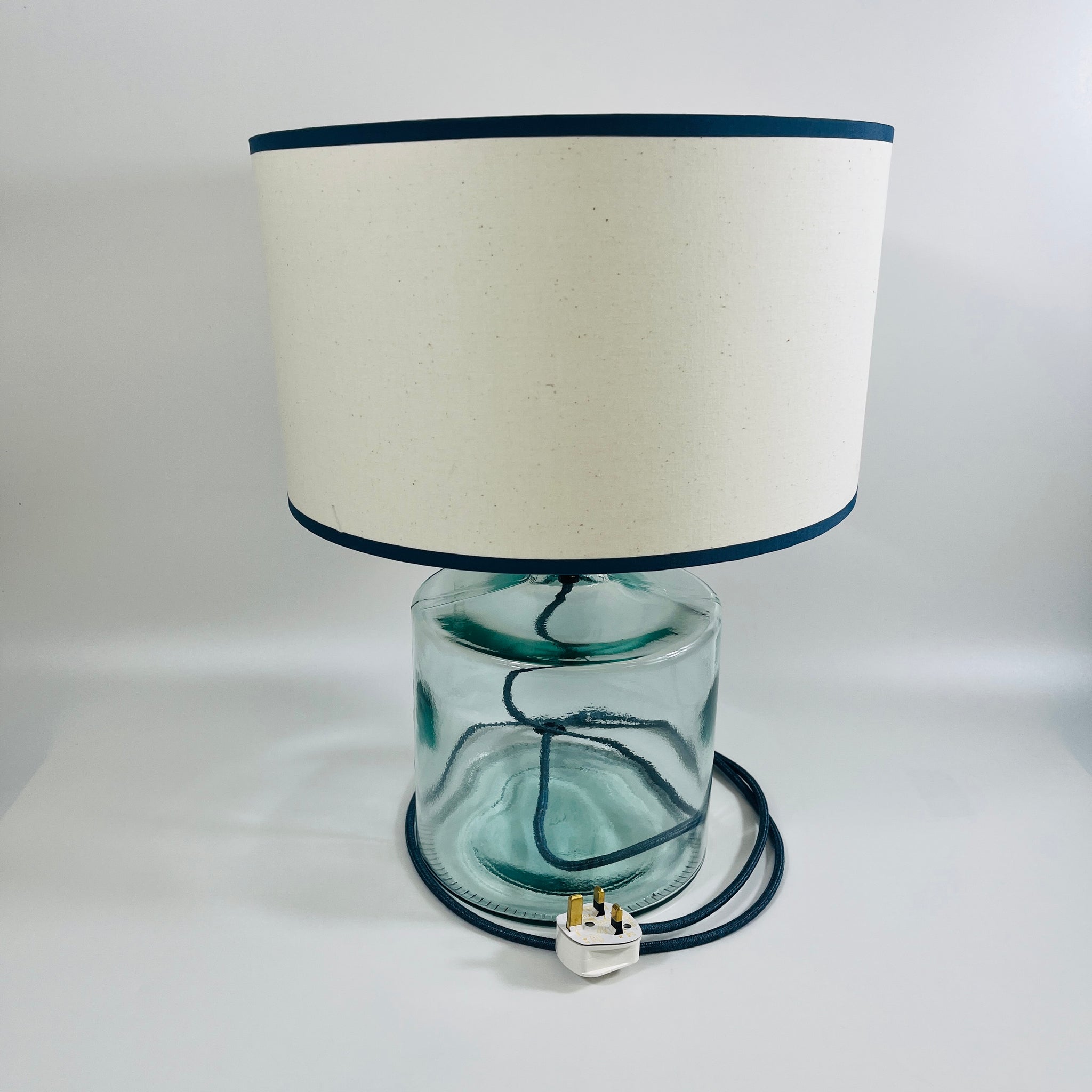 Our Frances lamp with co-ordinating flex and lampshade features a solid, round recycled glass base with natural cork and solid brass fittings. Its minimalist design complements both modern and traditional interiors.